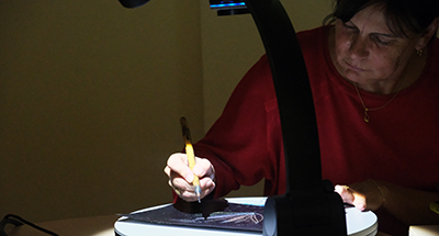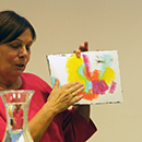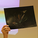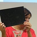 Während Heidi Lexe die Aufmerksamkeit auf unterschiedliche Techniken lenkt, kommen die „Textwüste in der Allgemeinliteratur“ und die Materialität von Büchern in der Kinder- und Jugendliteratur zur Sprache. Linda Wolfsgruber erklärt die Besonderheit von geschöpftem Papier, das nicht geschnitten wird, bestickt, bemalt und bedruckt werden kann und das sie bei „Immergrün“ (Zusammenarbeit mit Bodo Hell) ebenso verwendet hat, wie bei „Daisy ist ein Gänseblümchen“, das mit Buch und Ausstellung ein Ergebnis ihres Aufenthalts in Teheran war. Für Staunen sorgt sie mit der in „Arche“ angewandten Drucktechnik mit Wachsmalstiften für Kleinkinder und mit einer live Vorführung der Kratztechnik, die bei ihr so wunderbar leicht von der Hand geht, dass man sie tatsächlich selbst versuchen möchte. „Prinzessin Rotznase“ (Text: Martin Auer) ist schließlich ein theatrales Schauspiel unterschiedlicher Techniken, das sich auf einem Küchentisch als Bühne (Druck) mit Stabpuppen (kopiert) in Collagen und Radierungen entfalten.