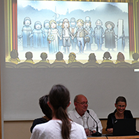 Für den Abend wechselte man dann in den inzwischen nicht mehr unbekannten Stephanisaal: Heidi Lexe schickte dem Werkstattgespräch mit Peter Schössow, der zum ersten Mal in der STUBE zu Gast war, voraus, dass er sich anstelle der Laufbahn als höherer Beamter doch der Hochschule für Gestaltung in Hamburg zuwandte. Von da an war er nicht nur dabei, sondern immer mitten drin und ist nebenbei auch noch mit der Frau verheiratet, die „Harry Potter“ nach Deutschland holte.