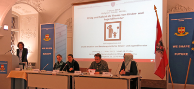 Am 17. März 2015 verschaffte sich das Team der STUBE Zutritt zu einer militärischen Liegenschaft. Höchst legal natürlich, galt es doch - in Kooperation mit dem Institut für Religion und Frieden der Katholischen Militärseelsorge Österreich - einen Nachmittag im Rahmen der Veranstaltungsreihe „Forum Ethik. Religion. Friede. Militär“ mit zu gestalten. In der Sala Terrena der Landesverteidigungsakademie Wien wurden "Krieg und Soldat als Thema von Kinder- und Jugendliteratur" aus Sicht verschiedener Disziplinen behandelt.